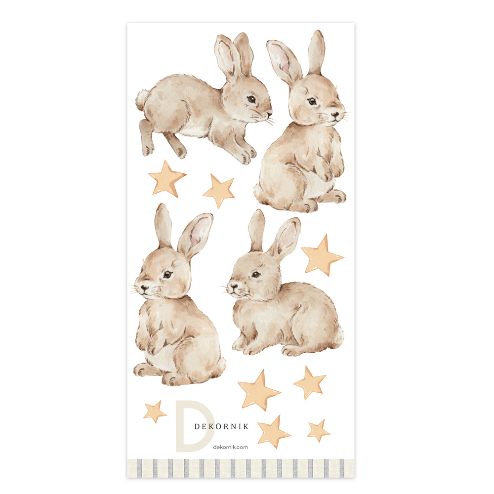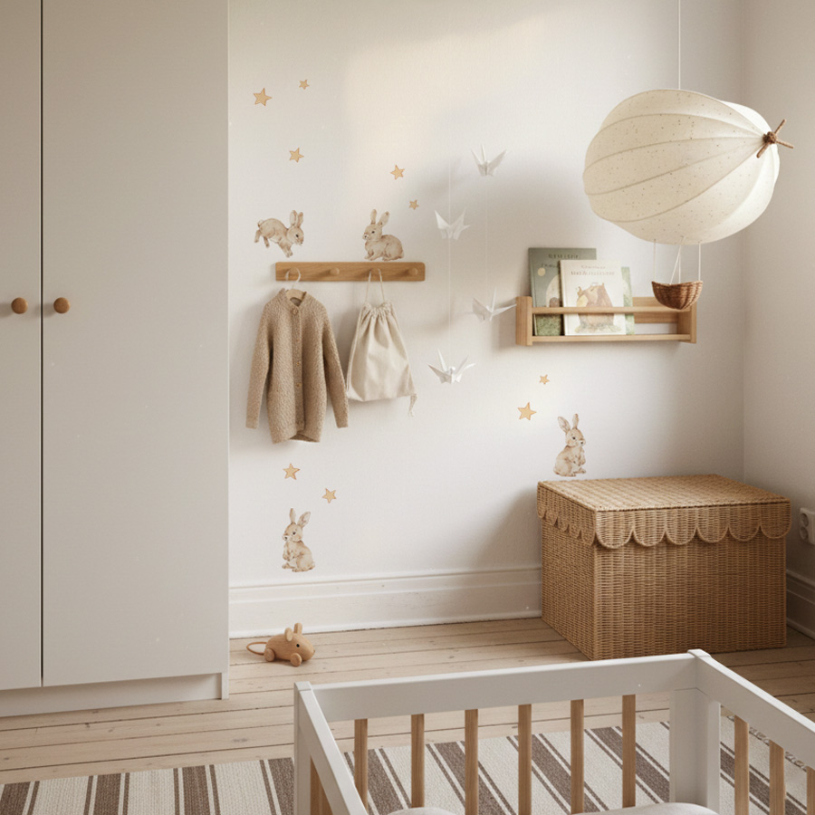 Delikatne króliczki w towarzystwie drobnych gwiazdek wprowadzą do pokoju magiczny, przytulny nastrój. To szybki sposób na dekorację bez decyzji o tapecie — idealny do mieszkań wynajmowanych i szybkich metamorfoz. Łatwo łączą się z gładkimi tekstyliami i meblami z naturalnego drewna. Drukowane na specjalnym, tkanym materiale poliestrowym przeznaczonym do dekoracji ścian (sprawdzona baza naklejek Dekornik!).