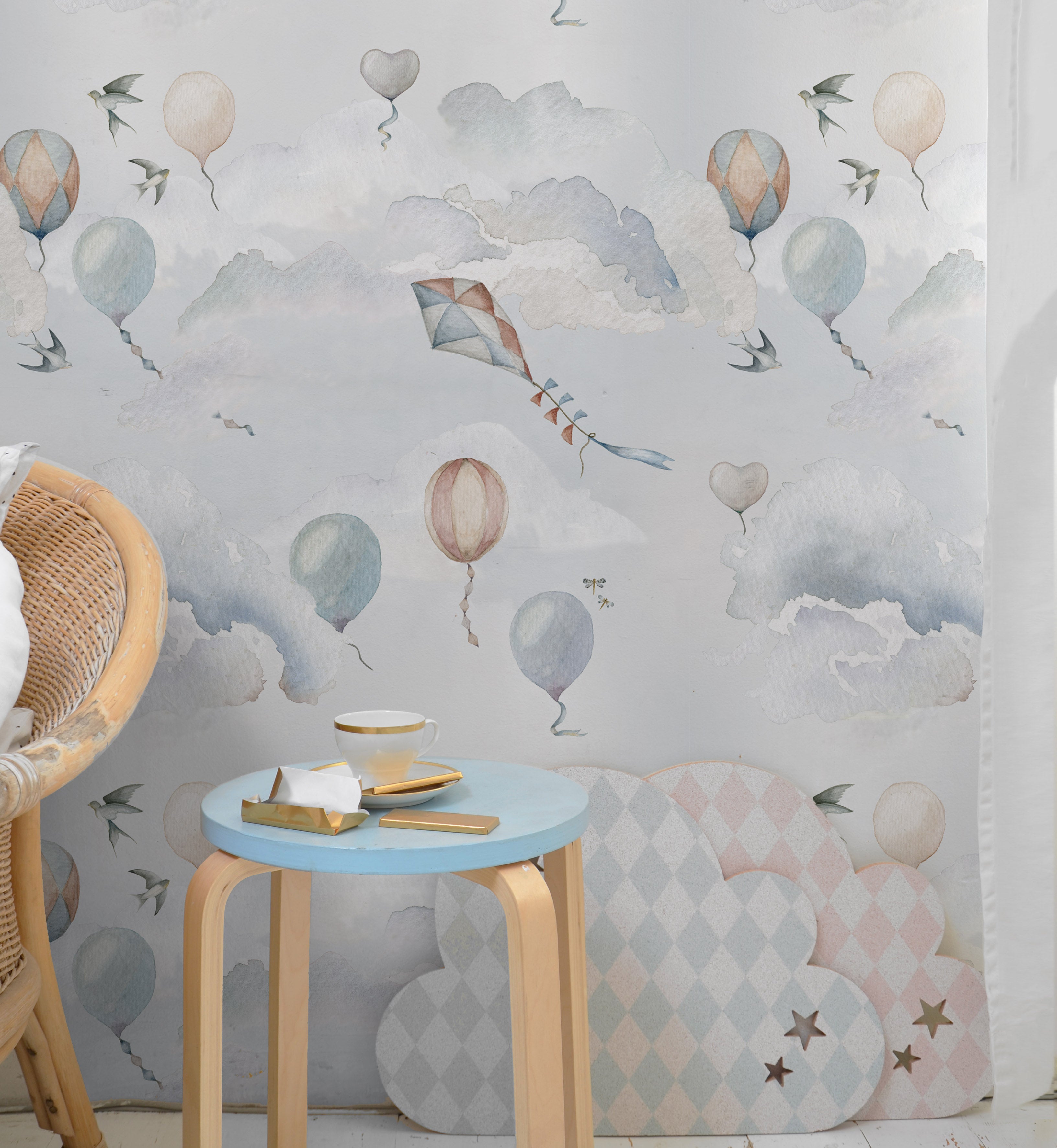 Here is the easiest way to create a fairytale in the room! A delicate pattern in shades of a blue and pastel rainbow. With all the elements emerging from the clouds your toddler will feel like they live in a magical room.