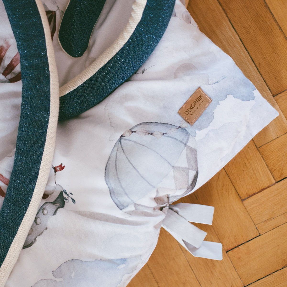 Both quilts and pillows are made of soft material elements like bows and strings. If you know our brand you know as well that that we pride ourselves on the fact that we don’t approve elements dangerous for babies, both in our plywood toy selection as well as in the beddings. It means our beddings don’t have zippers, buttons, or snaps. Nothing falls of or scatches a baby. We just added a little more material so that it wraps beautifully and protects the filling (20cm-thick material wrapped inside), and at last the bows are tied which adds to the bedding’s retro look.