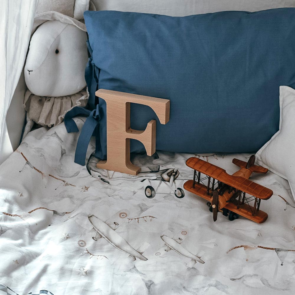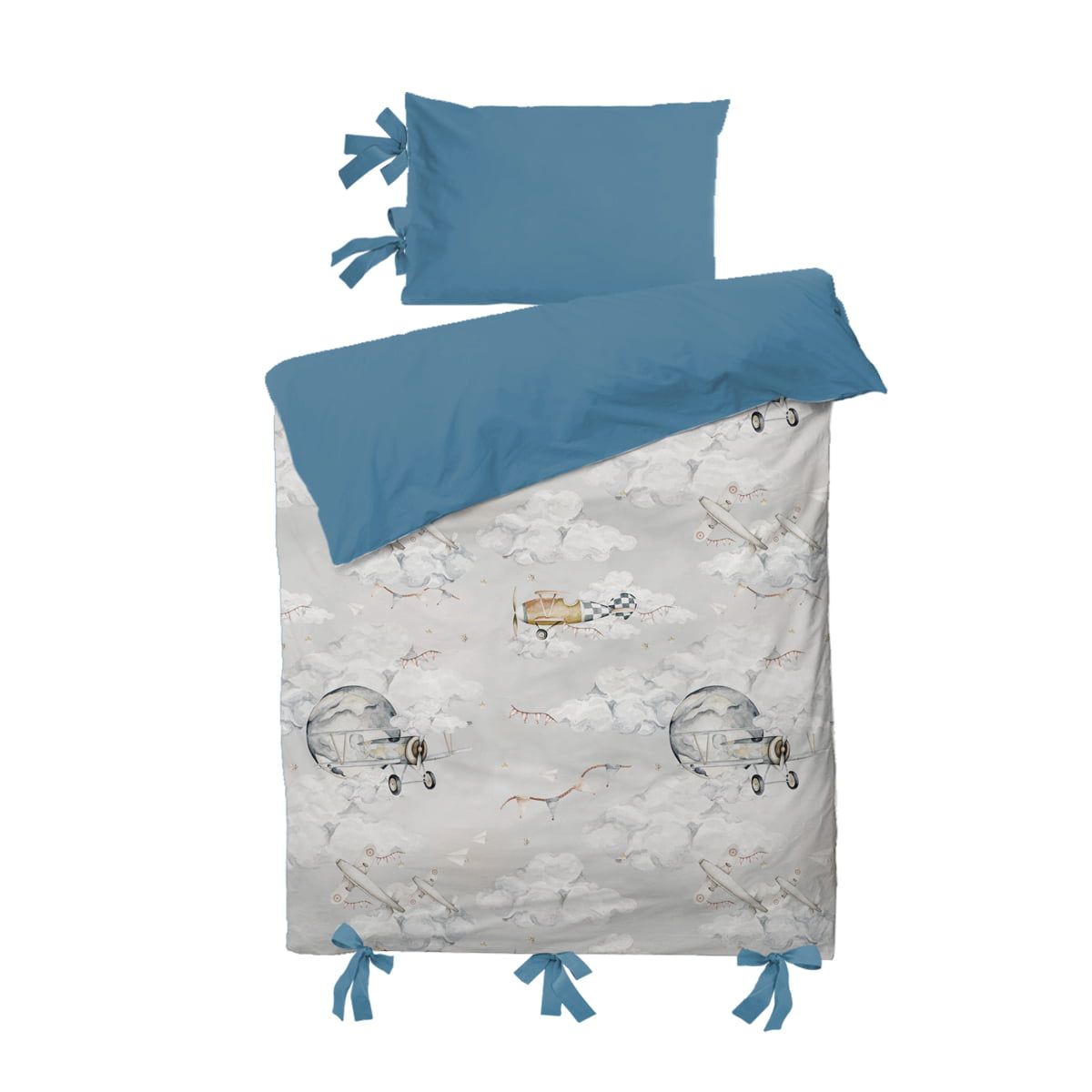 The bed sheets are sewn from printed material and from a single-color material selected to complement the colors of the print. This way, you can have a plane-themed quilt or a single-coloured, blue bedding depending on which side of the quilt you choose to place up on your bed. In this set you will also find a single colored pillow case in a matching colour. We are also planning on launching a selection of printed designs pilows to match the quilts in the future.