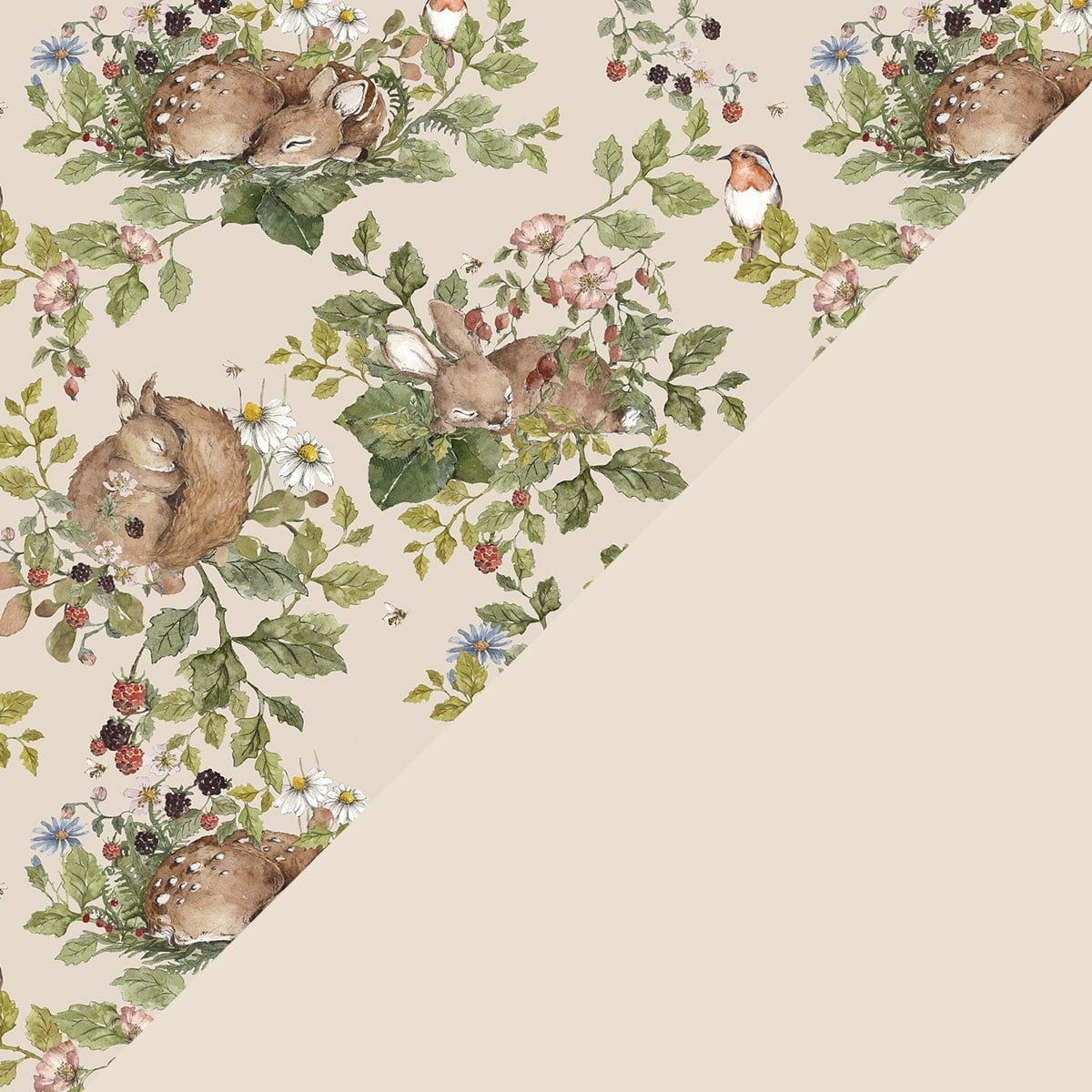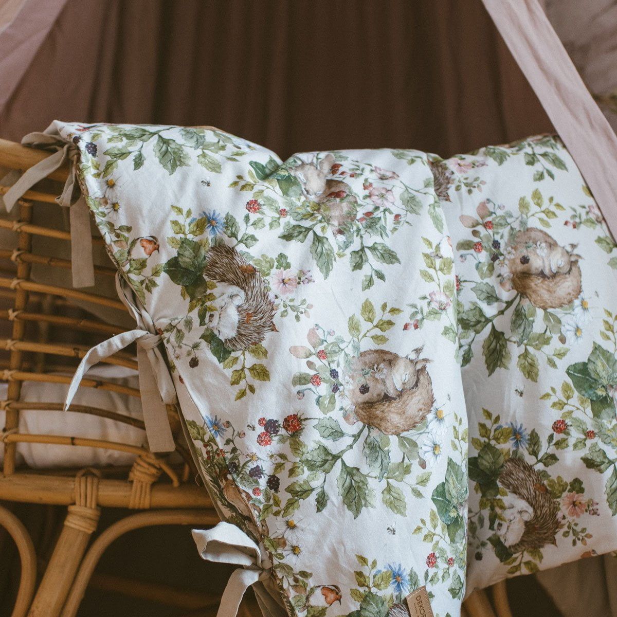 The bed sheets are sewn from printed material and from a single-color material selected to complement the colors of the print. This way, you can have a Sleepy Animals-themed quilt or a single-coloured light beige bedding, depending on which side of the quilt you choose to place up on your bed. In this set you will also find a single colored pillow case in a matching colour. We are also planning on launching a selection of printed designs pilows to match the quilts in the future.