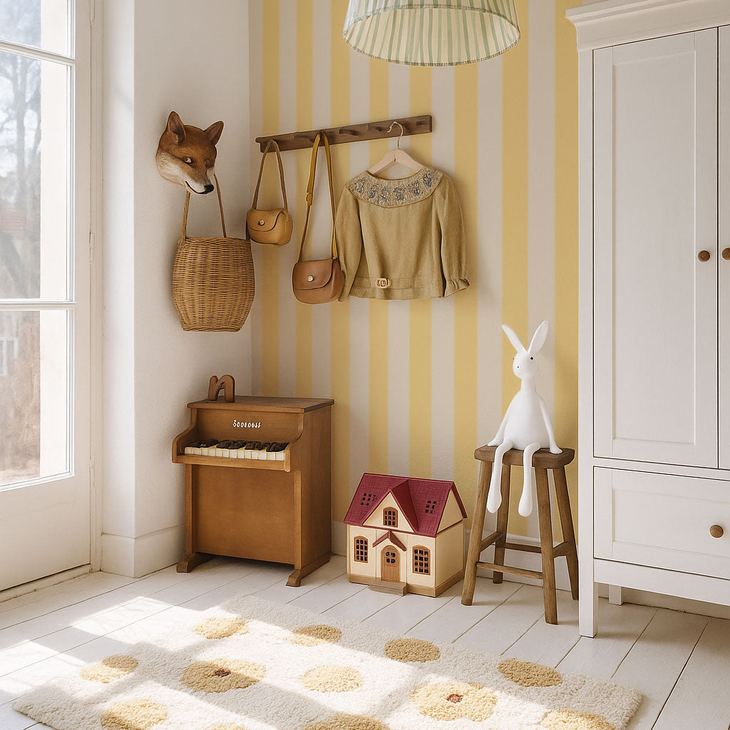 Gelati Limone Wallpaper is a wallpaper designed for a calm-but-fun kids’ interior. A clean stripe repeat that reads beautifully from a distance and up close. Best as a feature wall behind a crib/bed, or wrap the whole room if you love the pattern. Pair it with a matching border to ‘frame’ the wall and lift the whole look. Printed on Dekornik’s refined matte paper (snow-white, durable) and made with an eco & safety mindset.
