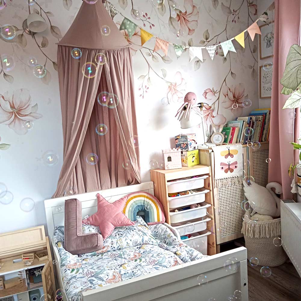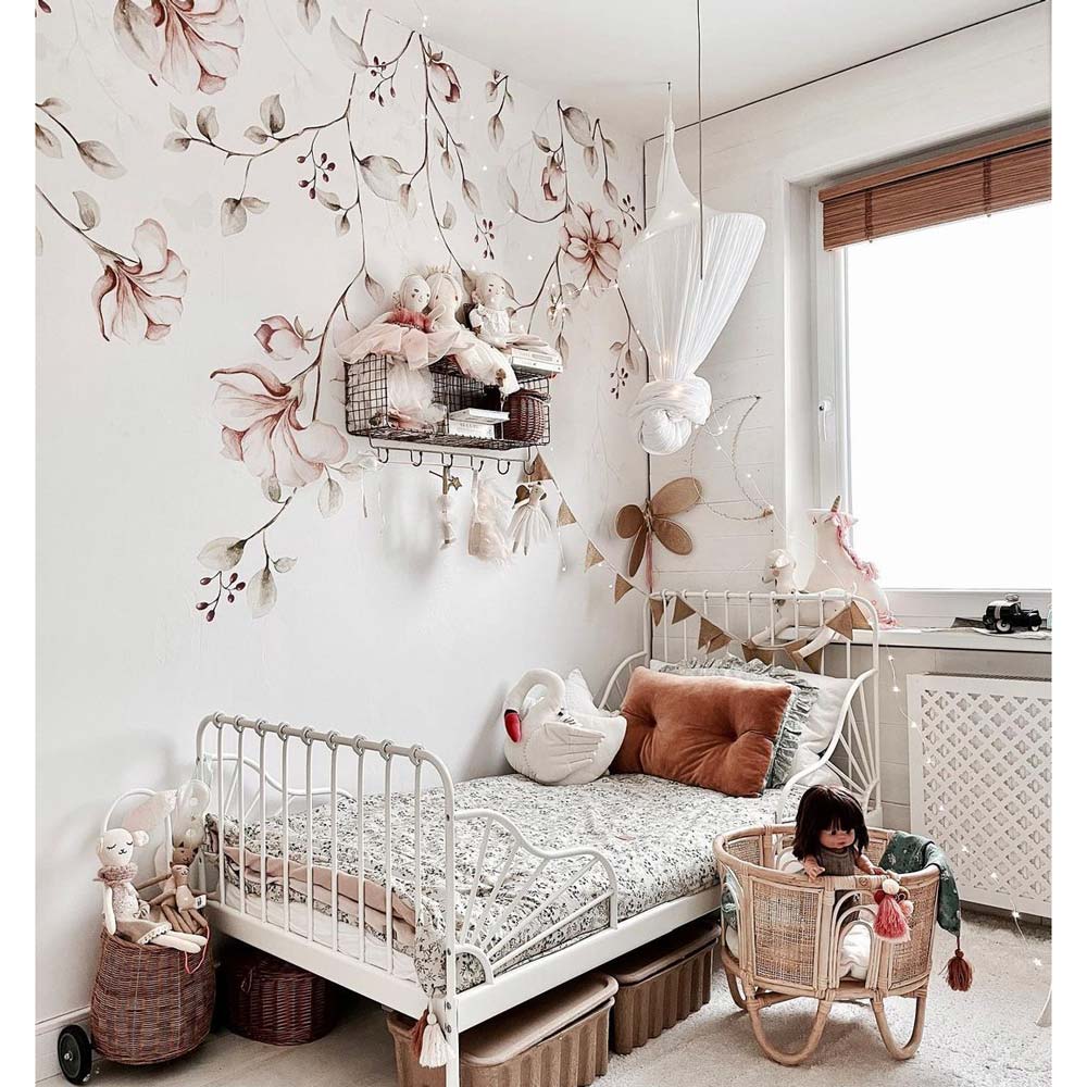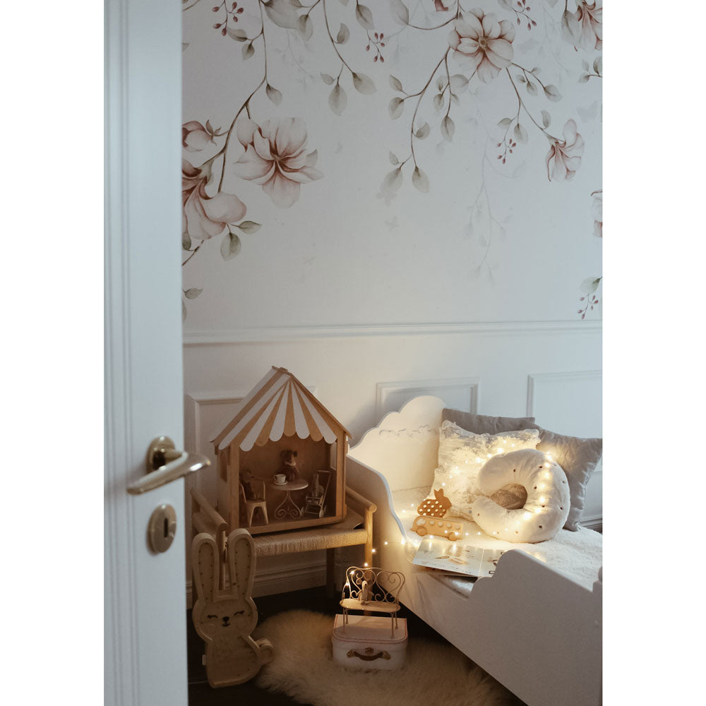 The Wallpaper Paradise Garden Twigs Pastel is a version for those who love large flowers and salmon colour. The branches that can be seen at the top will not get covered by any furniture in the room (except for tall wardrobes and shelves, of course). They also give the impression, especially when attached above the cradle, of beautiful flowers sprinkling just above the baby’s head. Now, that is a fairy-tale spring effect! The flowers are on a white background. The pattern was designed by Kasia “Bachor” Rostkowska.