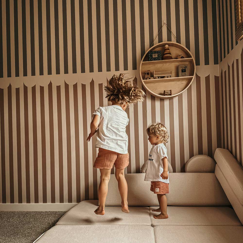 This wallpaper is our favourite one. If you don’t know what wallpaper you want for your children’s room … this is your choice! Rustic is a combination of a classic pattern (stripes) with a frill, which makes the wallpaper look like a child. It is both classic and sweet at the same time. Perfect for rooms with a cradle, but also for parents’ bedroom, with a children’s corner. The width of the stripes is 5 cm, and the colors are beige, soft brown and classic subtle blue.