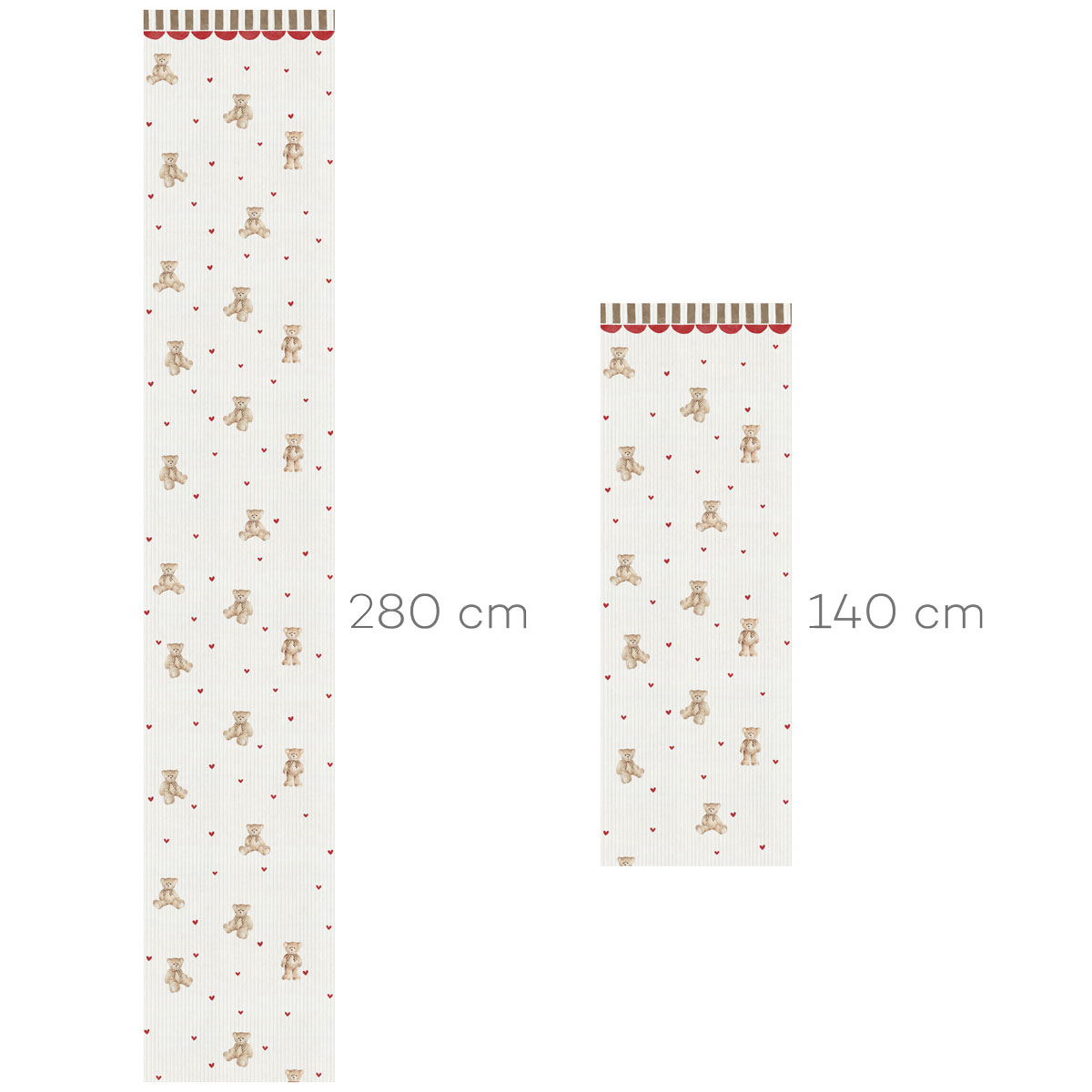 Teddy bears with a slight French touch (color). With an ornament at the top that perfectly highlights the ceiling lines. The background of this wallpaper graphically resembles a material – corduroy, and the teddy bears are painted with watercolors.