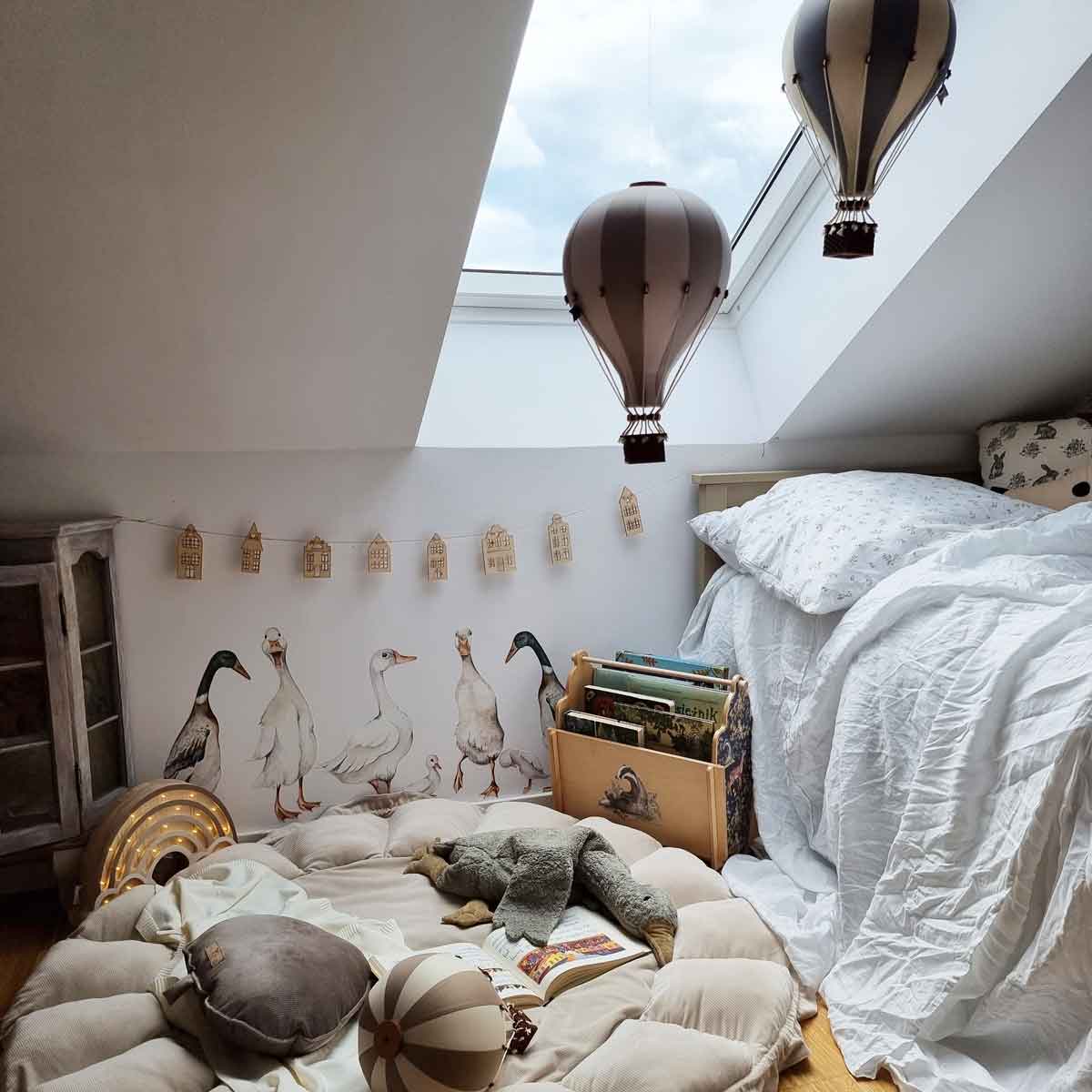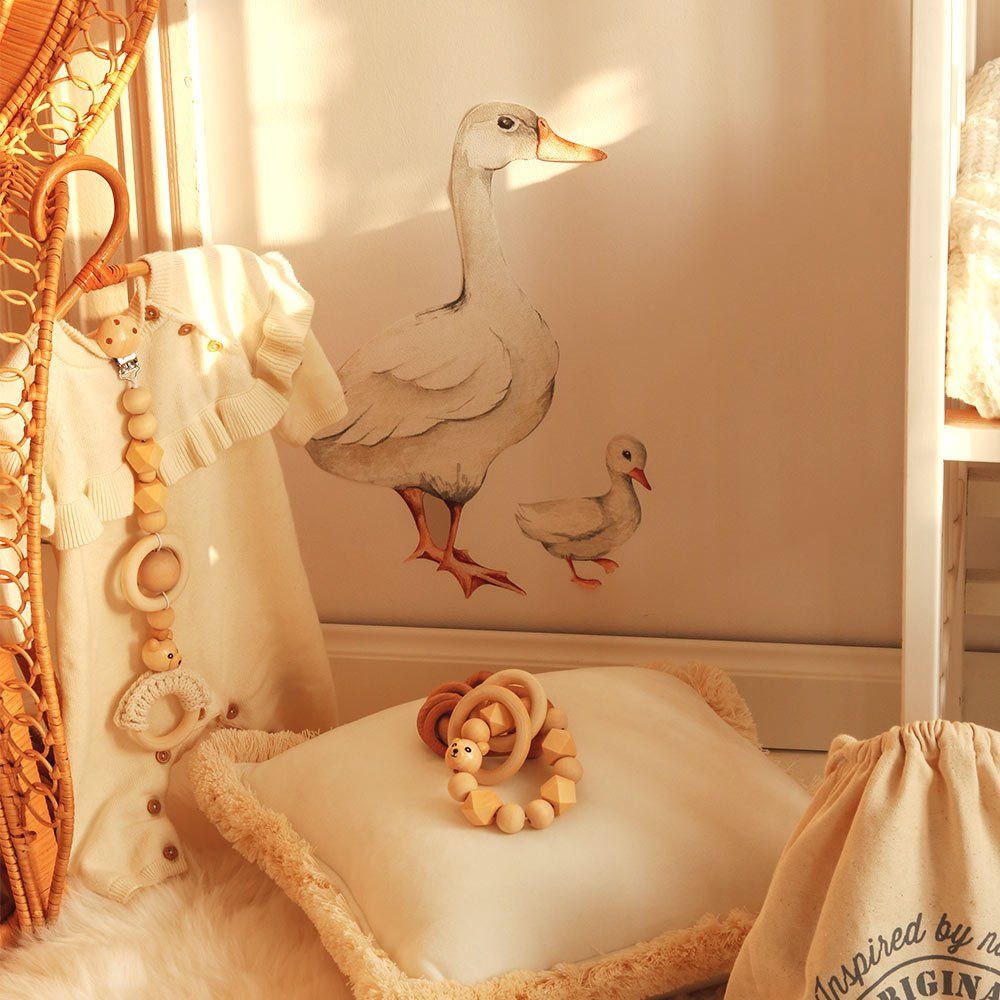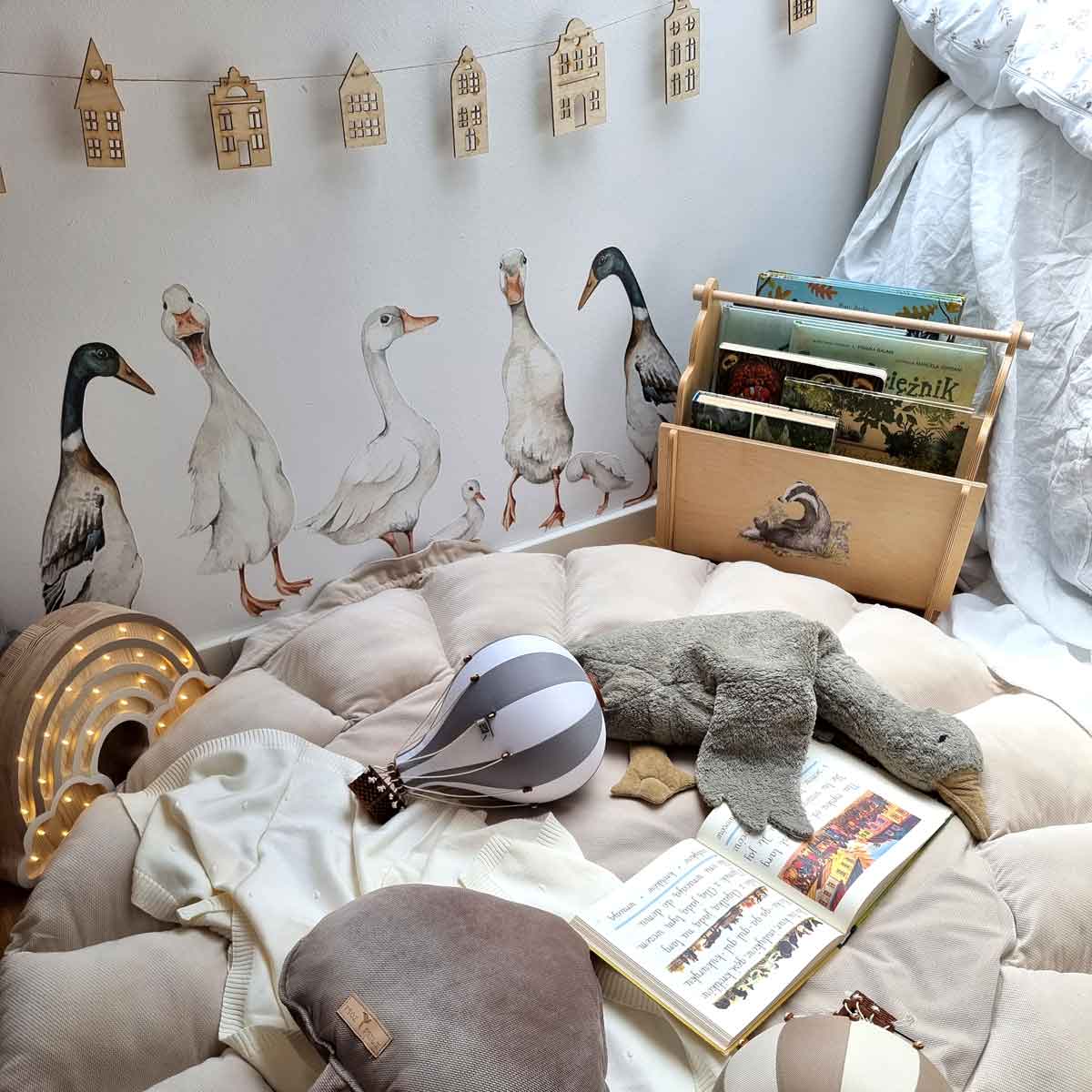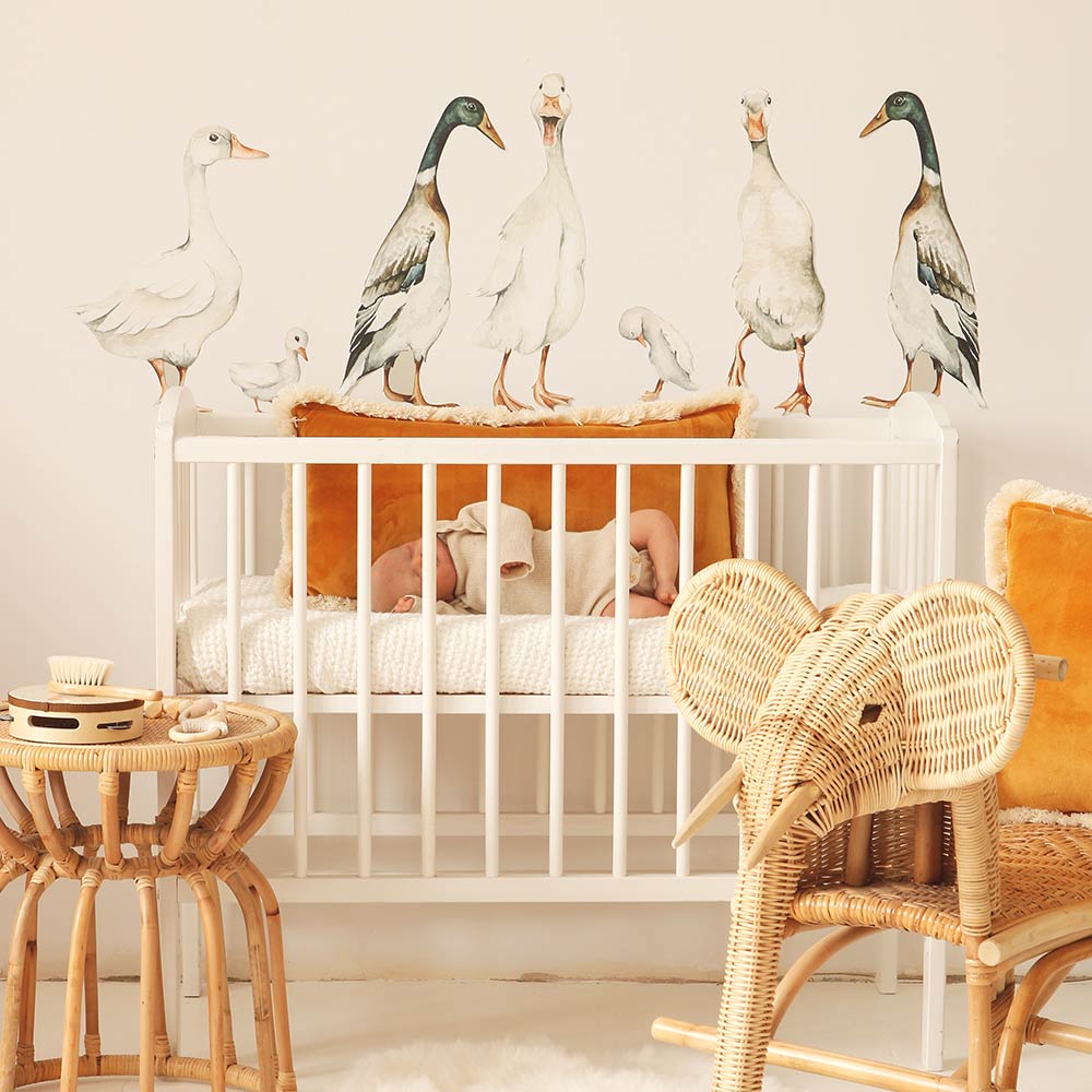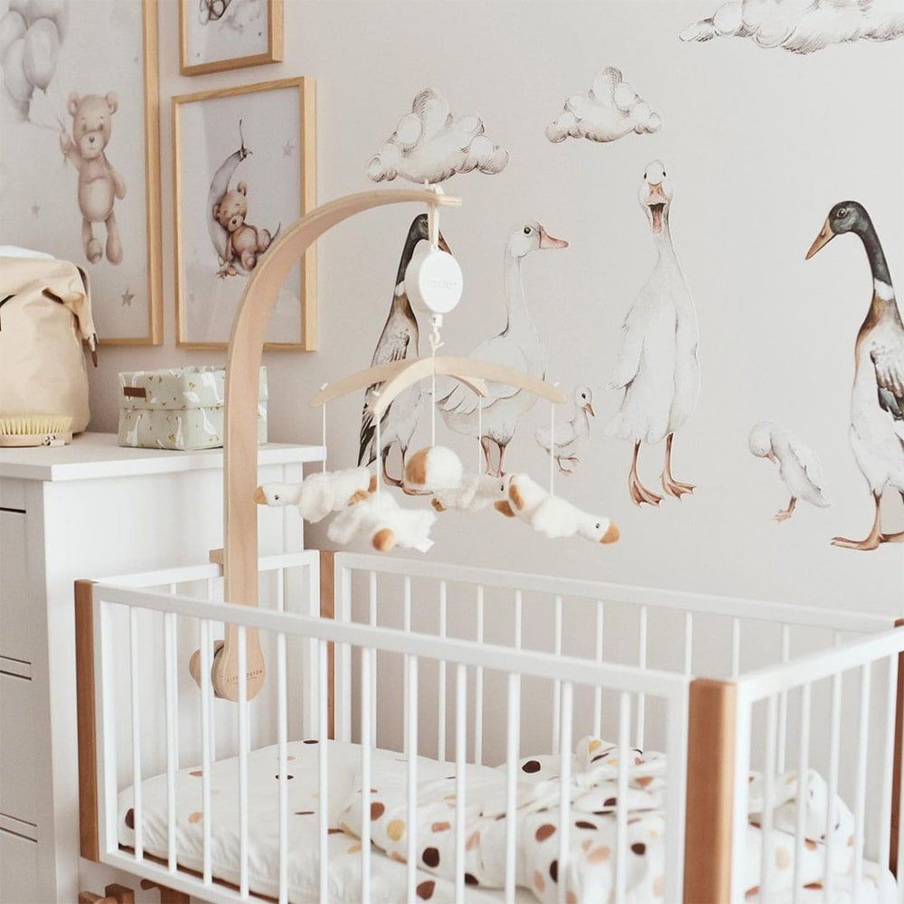 White Ducks / Return to Innocence is a wall decal in a white-leaning palette, designed for a calm-but-fun kids’ interior. Ducks and pond-like details — gentle nature, perfect for nurseries. A quick way to decorate without committing to wallpaper — perfect for rentals and quick refreshes. Easy to mix with plain textiles and natural wood furniture. Printed on a special woven polyester material made for wall decoration (Dekornik’s go-to sticker base).