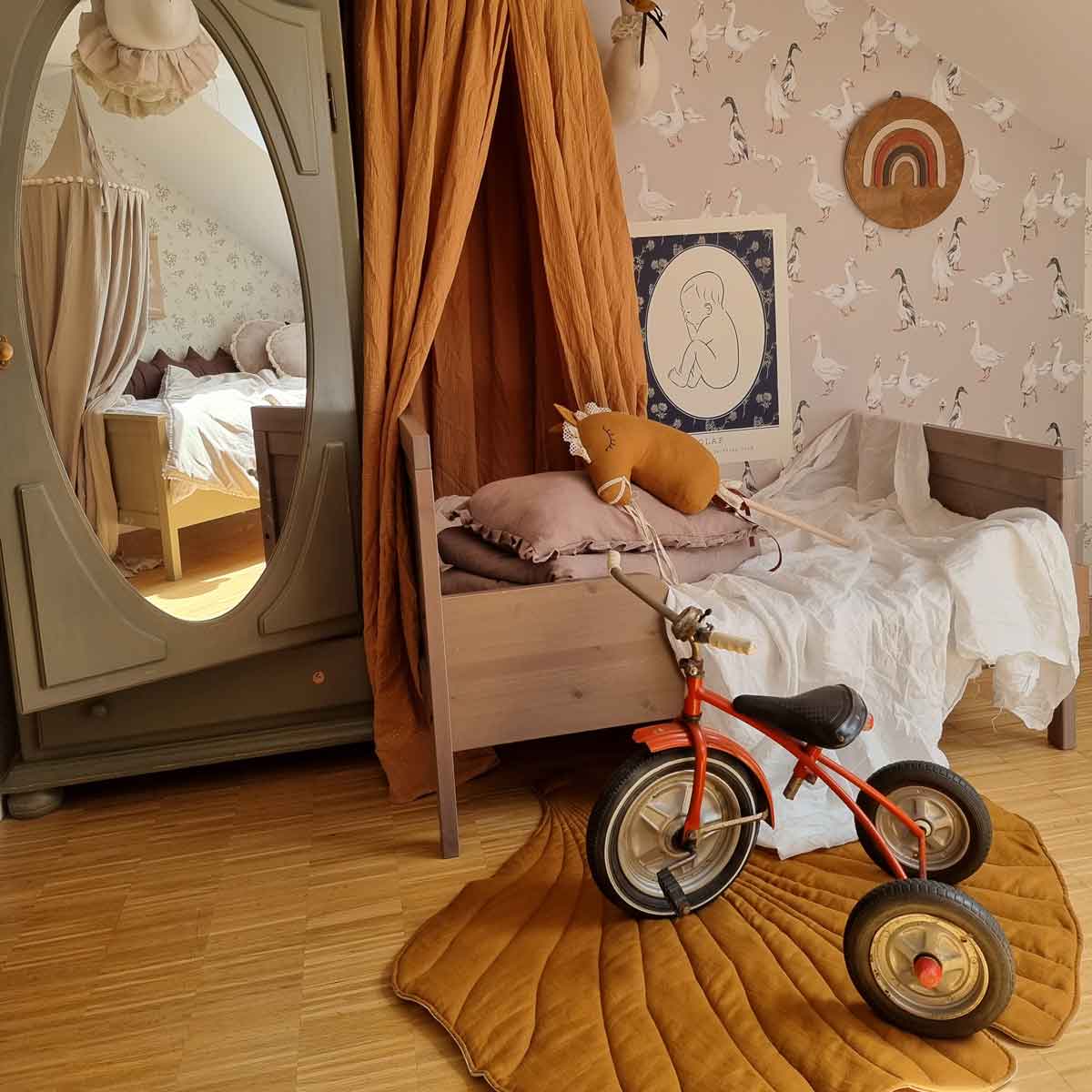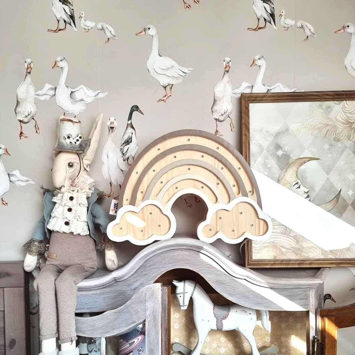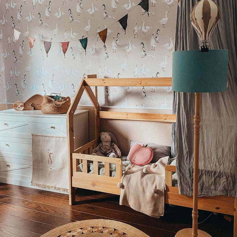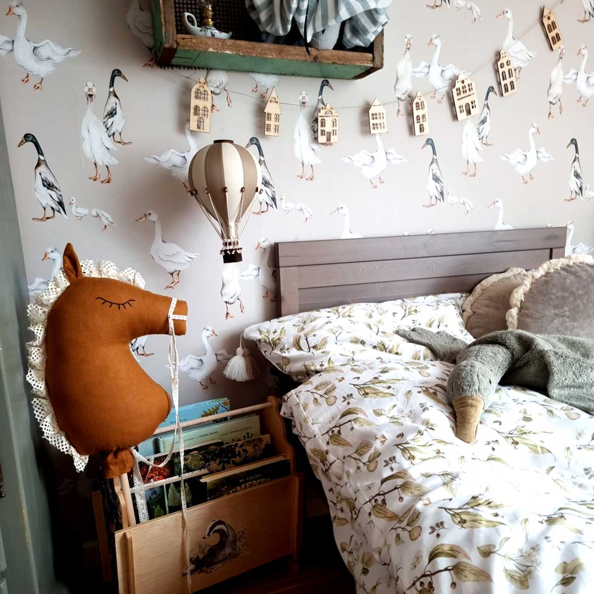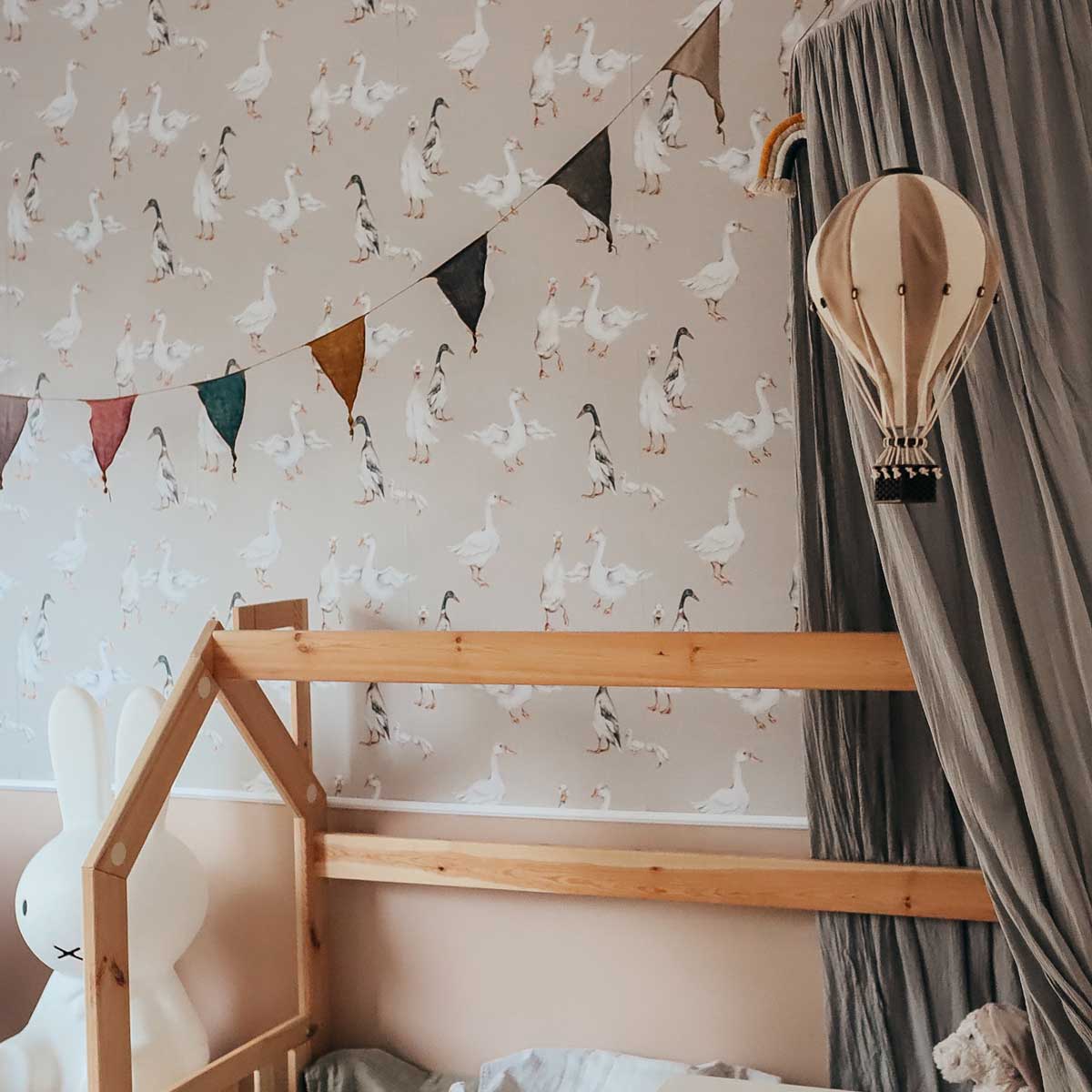 White ducks wallpaper is a perfect choice for a boy’s room or a girl’s room. Or siblings. And it’s because the colour are neutrals (beige backgroiund) and the ducks are pained like in an old english wallpaper. Cute but not too childish.