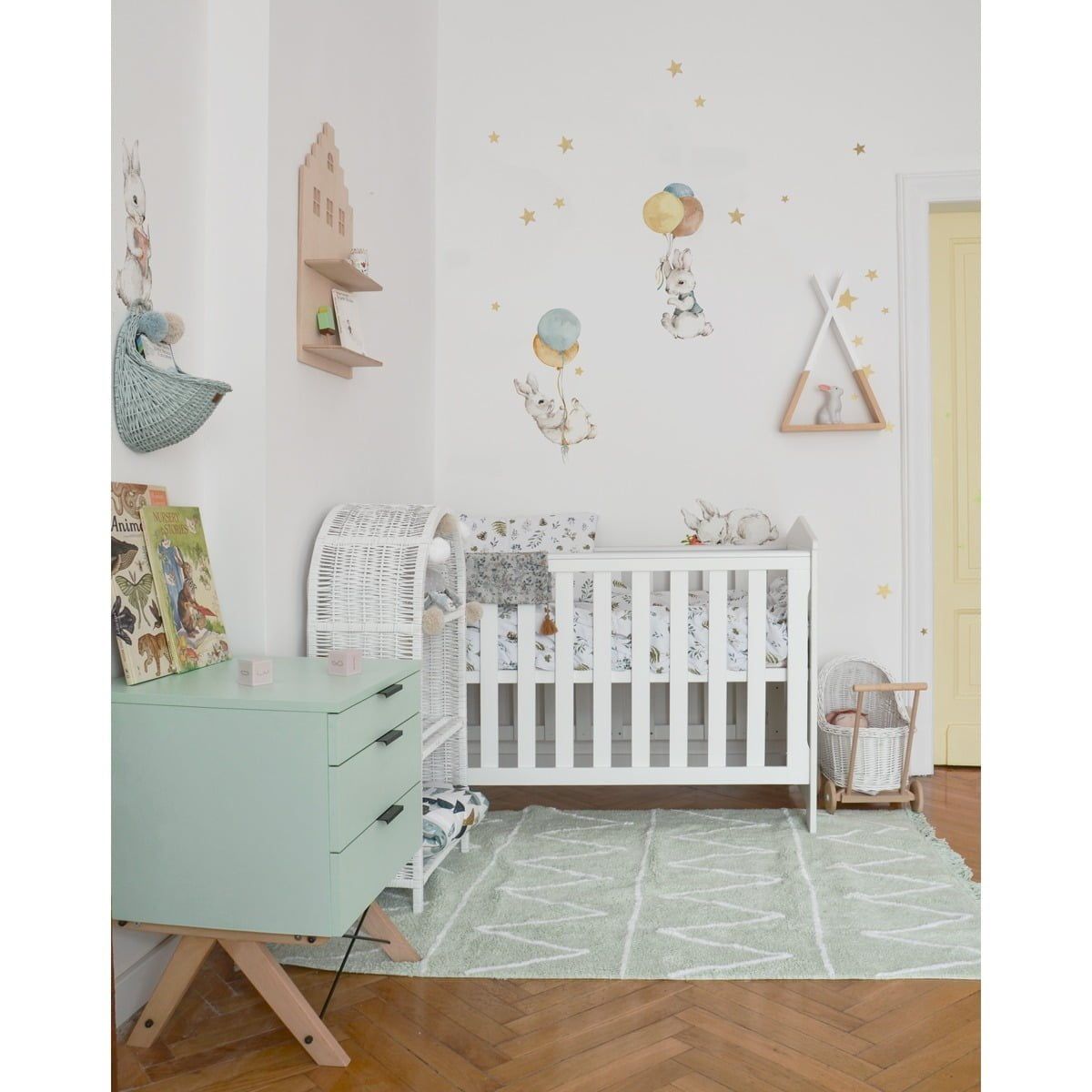 White Happy Rabbits Wonderland Set is a wall decal designed for a calm-but-fun kids’ interior. Little stars scattered like a calm night sky — perfect for bedtime corners. A quick way to decorate without committing to wallpaper — perfect for rentals and quick refreshes. Easy to mix with plain textiles and natural wood furniture. Printed on a special woven polyester material made for wall decoration (Dekornik’s go-to sticker base).
